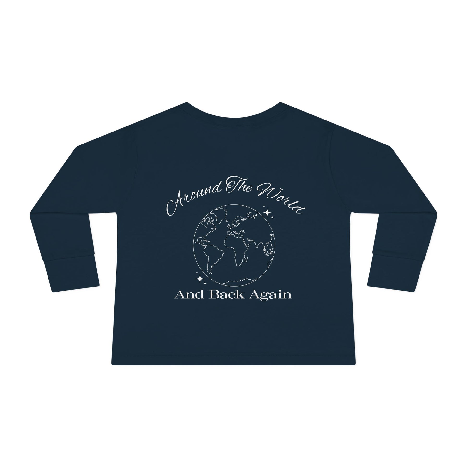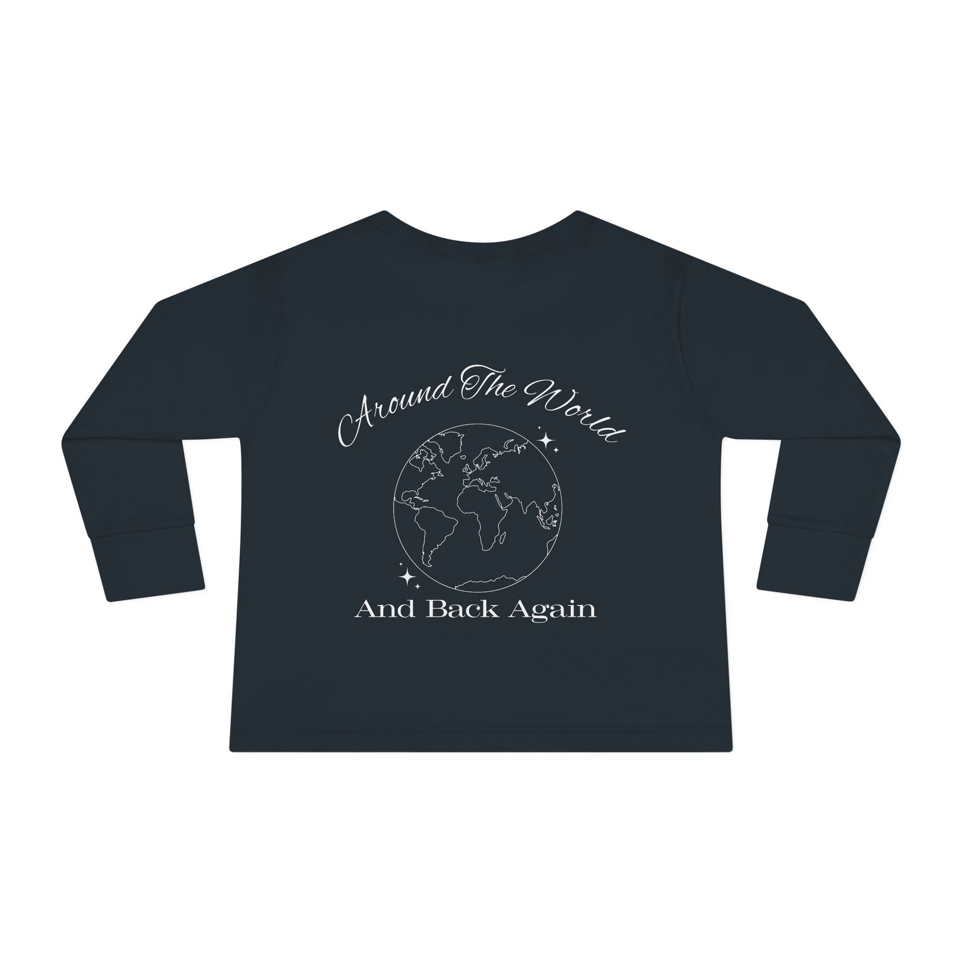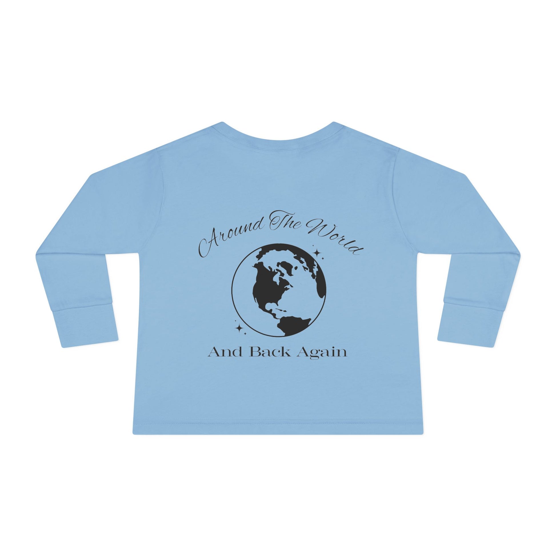 Adorable long sleeve toddler shirt inspired by the song 'Around The World'. Perfect for young music lovers and fans of cute clothing. Ideal for casual wear and playtime. Relevant for musical-themed birthdays and everyday wear.