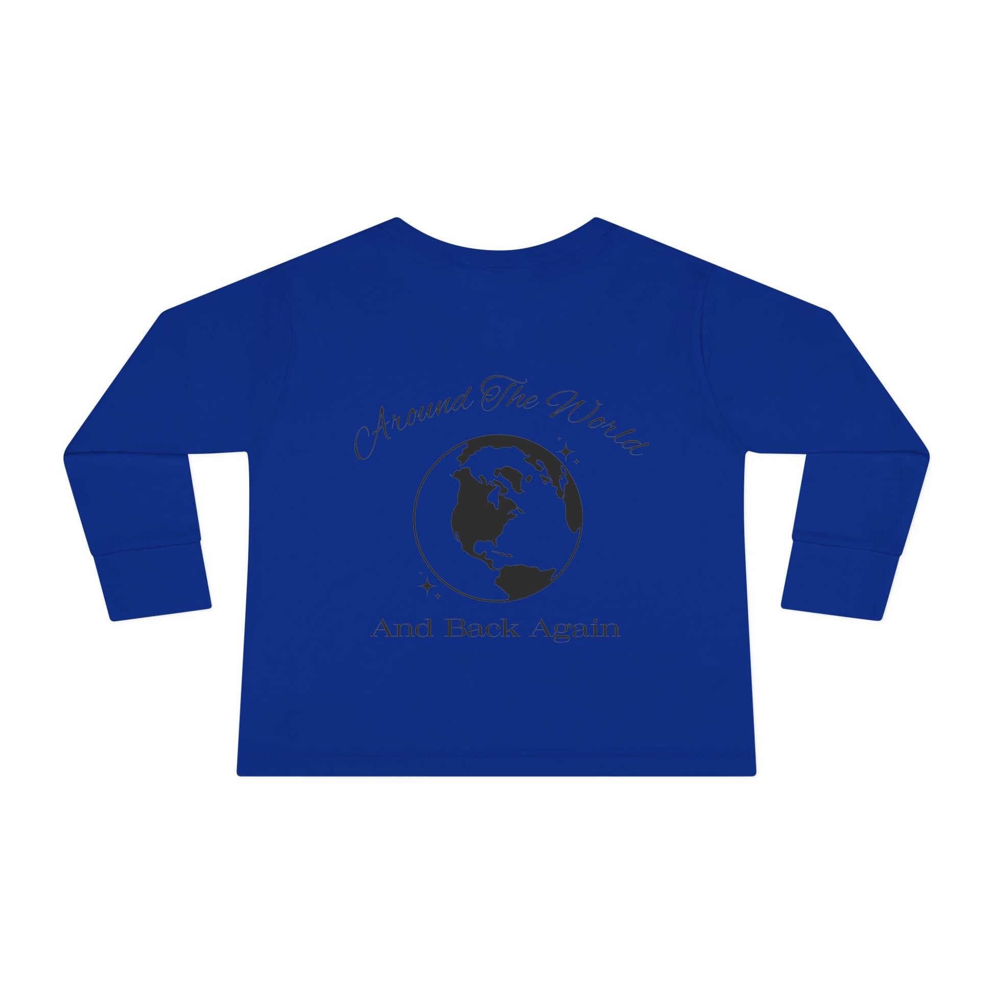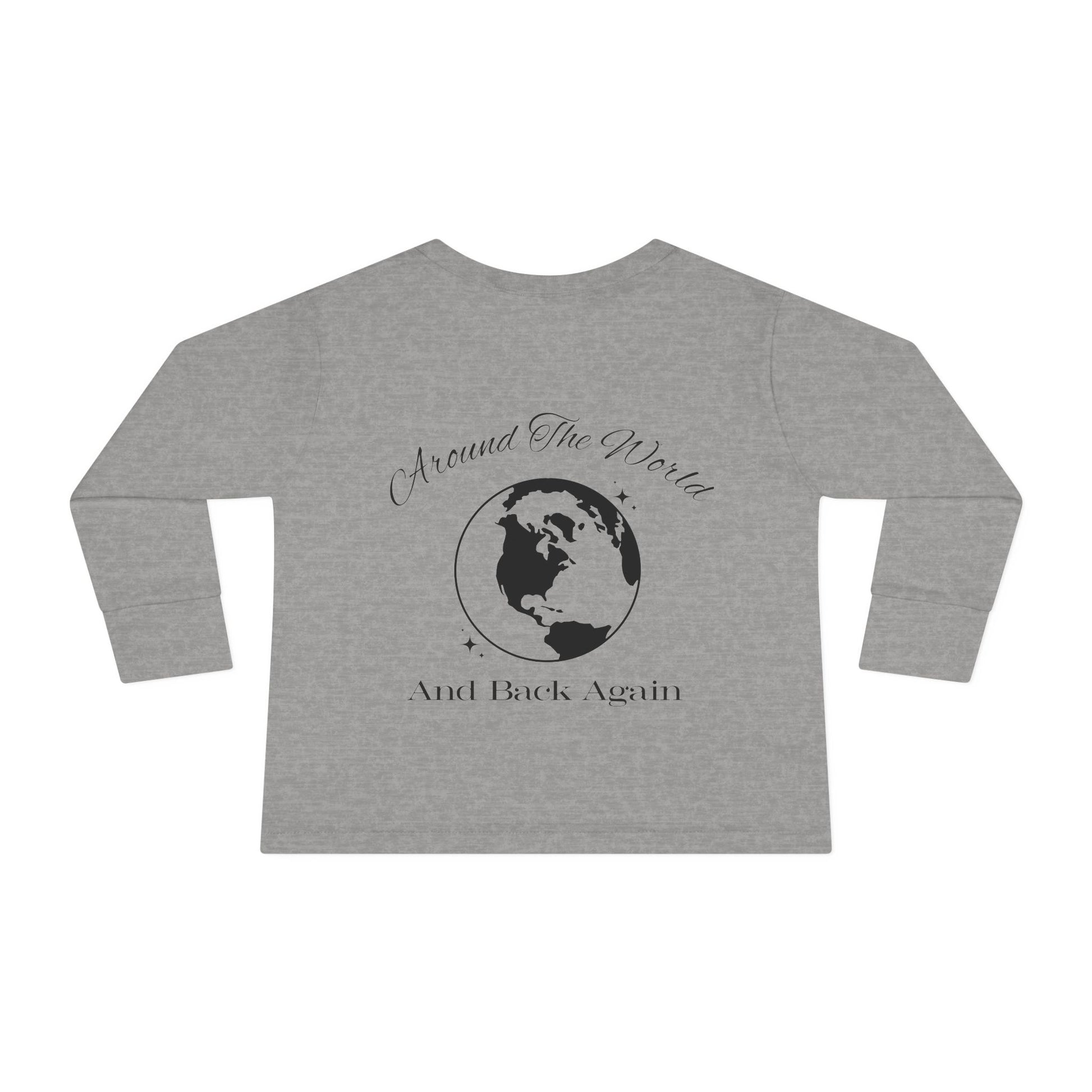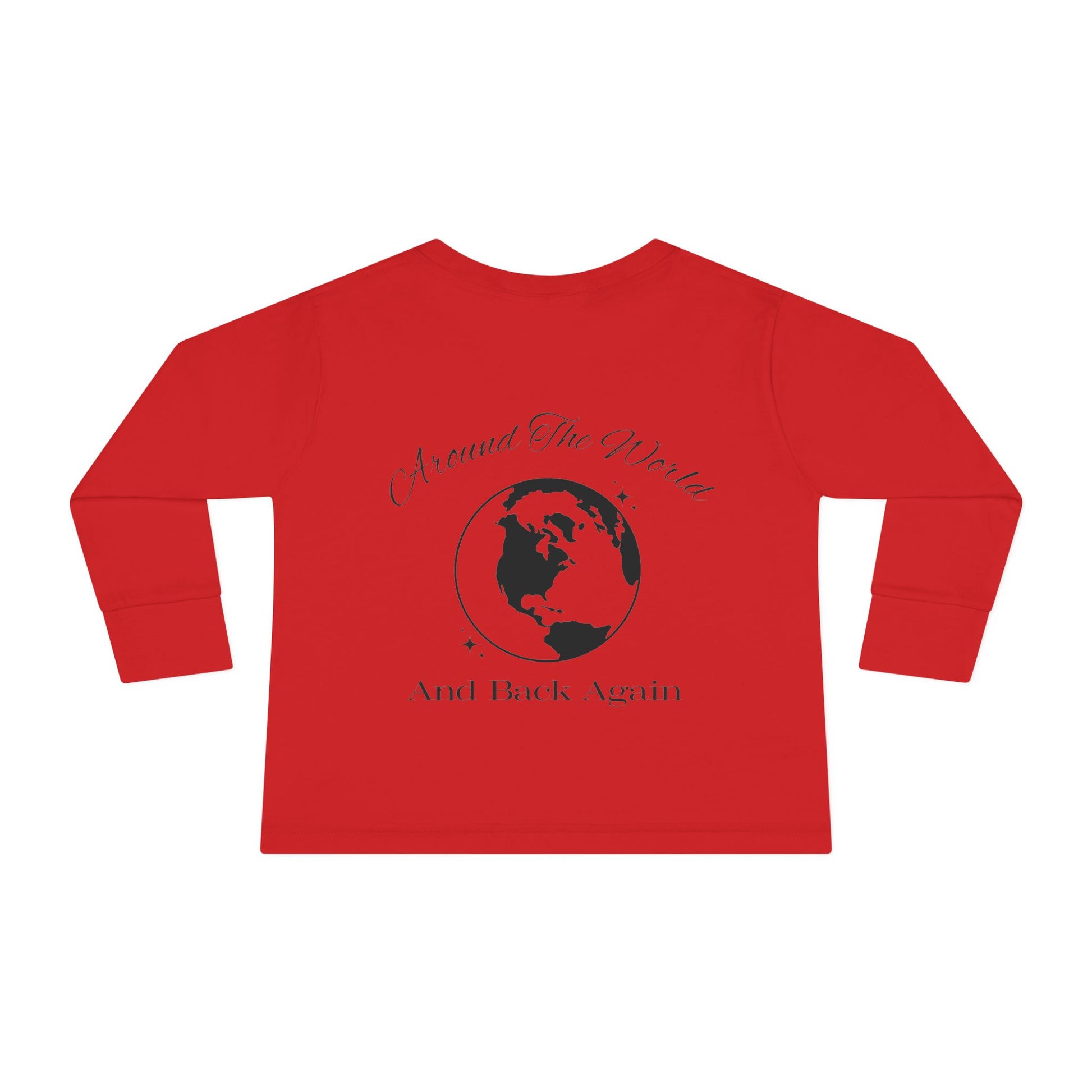 Adorable long sleeve toddler shirt inspired by the song 'Around The World'. Perfect for young music lovers and fans of cute clothing. Ideal for casual wear and playtime. Relevant for musical-themed birthdays and everyday wear.